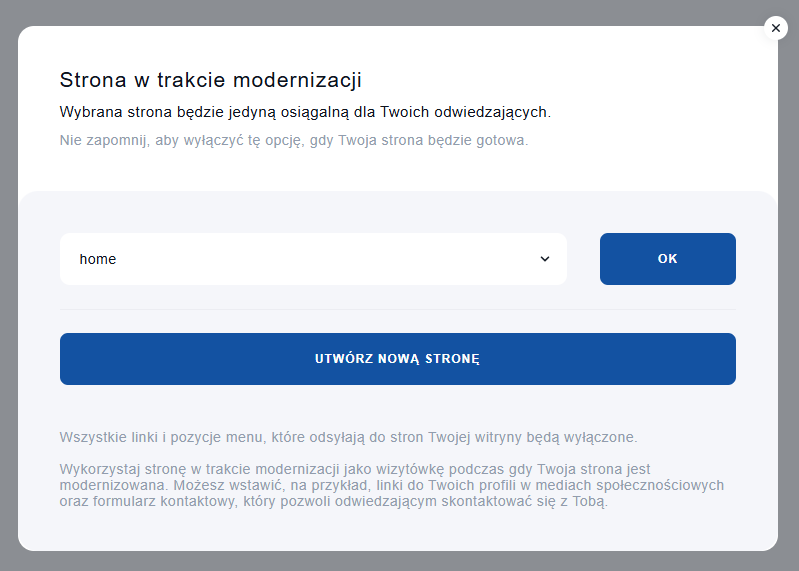 3. Aktywuj opcję "Strona w trakcie modernizacji".