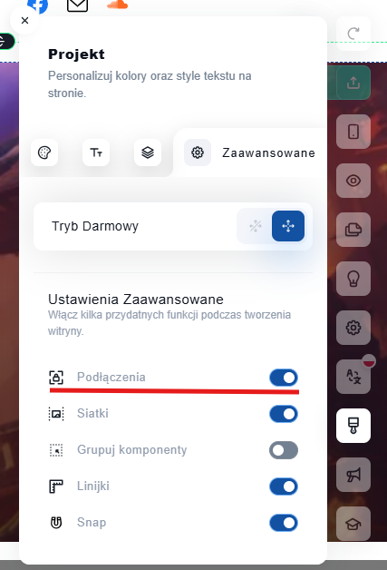 Edytor SuperSite pozwala na przypięcie komponentów w wybranych miejscach na stronie za pomocą funkcjonalności Podłączenia. Funkcja pozwala na zachowanie elementów, takich jak menu nawigacyjne lub logo, zawsze widocznych w czasie przewijania strony.